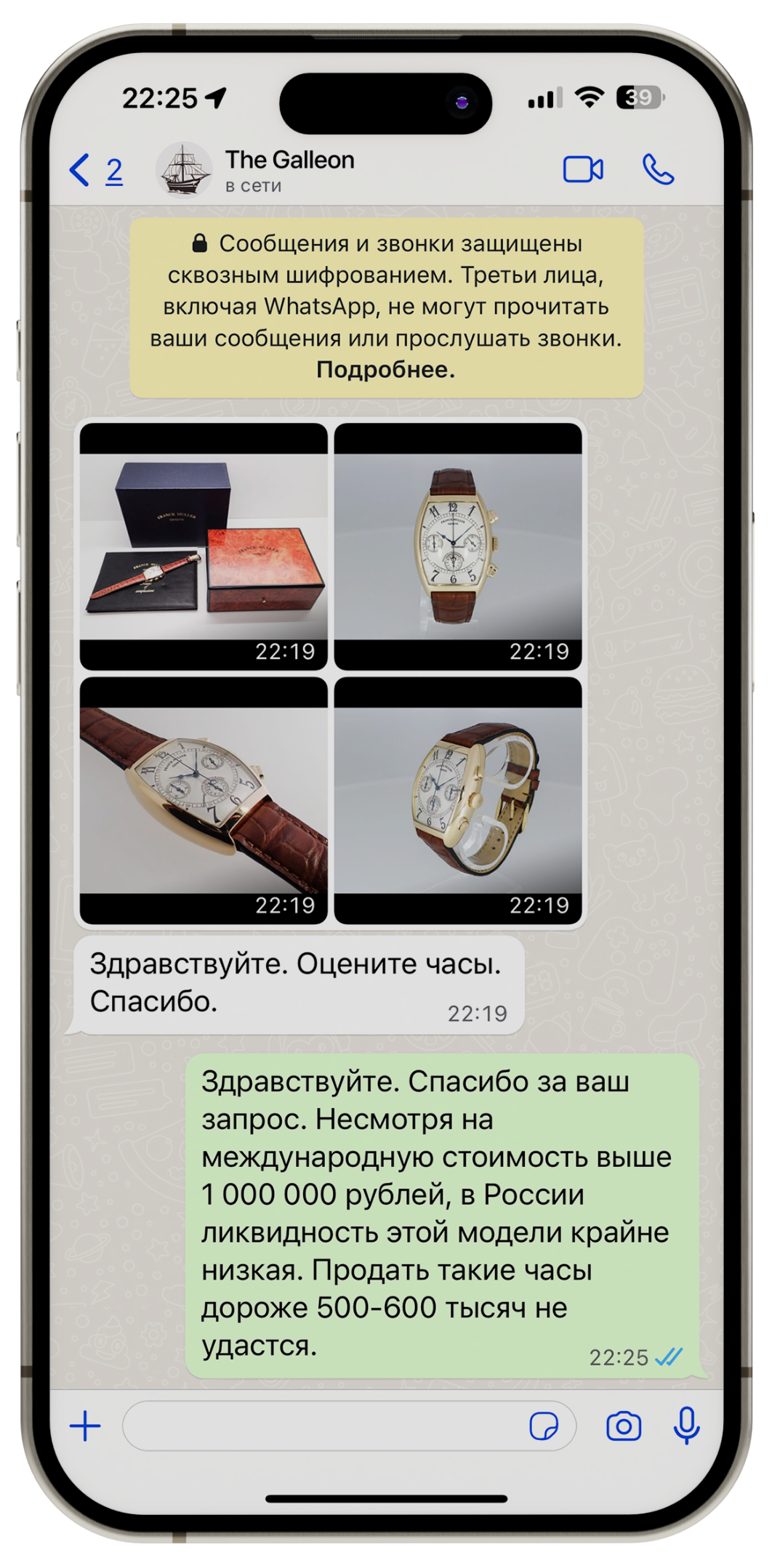 Для часов этой и более высокой ценовой категории мы проведем дополнительную диагностику на профессиональном оборудовании в нашей мастерской или в любой другой из списка, который мы предоставляем. Это необходимо для точной оценки и гарантии лучшей цены для вас.